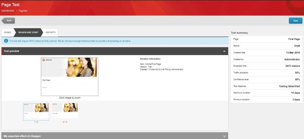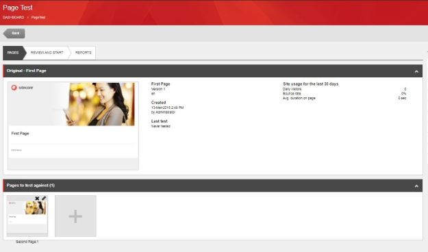 Step 3: Go to Review and Start Tab. After selecting the pages for testing, Sitecore displays the information about the test also you can adjust a number of parameters for the test. Sitecore displays previews of the pages that you have selected, with one variation selected and the other variations in the carousel under the selected variation